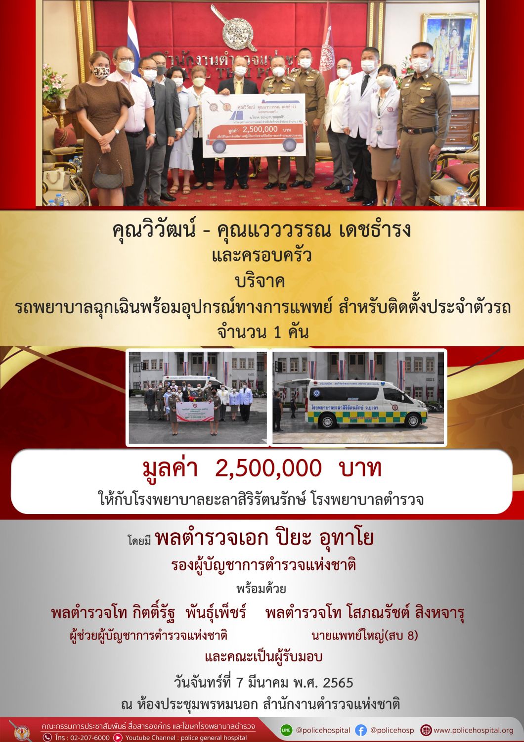 เมื่อวันจันทร์ที่ 7 มีนาคม พ.ศ. 2565 พลตำรวจเอก ปิยะ อุทาโย รองผู้บัญชาการตำรวจแห่งชาติ พลตำรวจโท กิตติ์รัฐ พันธุ์เพ็ชร์ ผู้ช่วยผู้บัญชาการตำรวจแห่งชาติ พลตำรวจโท โสภณรัชต์ สิงหจารุ นายแพทย์ใหญ่(สบ8) และคณะ ร่วมพิธีรับมอบ รถพยาบาลฉุกเฉินพร้อมเครื่องมือพยุงชีพชั้นสูง จำนวน 1 คัน มูลค่า 2,500,000 บาท จากคุณวิวัฒน์ - คุณแวววรรณ เดชธำรง และครอบครัว  โดยมี พันตำรวจเอก ชัยวัฒณ์  ศรีอัศวอมร  รองผู้บังคับการกองร้องทุกข์  สำนักงานคณะกรรมการข้าราชการตำรวจ เป็นผู้ประสานงาน/และร่วมบริจาค   เพื่อใช้ในภารกิจช่วยเหลือนำส่งผู้ป่วยฉุกเฉิน แก่โรงพยาบาลยะลาสิริรัตนรักษ์ โรงพยาบาลตำรวจ ณ ห้องพรหมนอก อาคาร 1 ชั้น 2 สำนักงานตำรวจแห่งชาติ ชั้น 2 สำนักงานตำรวจแห่งชาติ