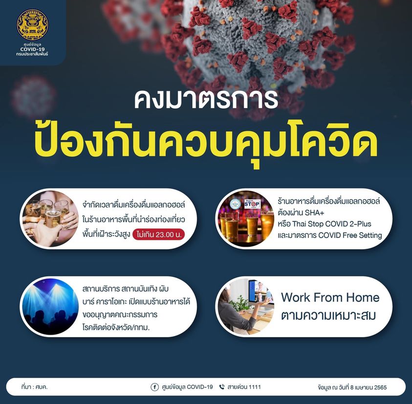 • จำกัดเวลาดื่มเครื่องดื่มแอลกอฮอล์ในร้านอาหาร พื้นที่นำร่องท่องเที่ยว/พื้นที่เฝ้าระวังสูง ไม่เกิน 23.00 น.