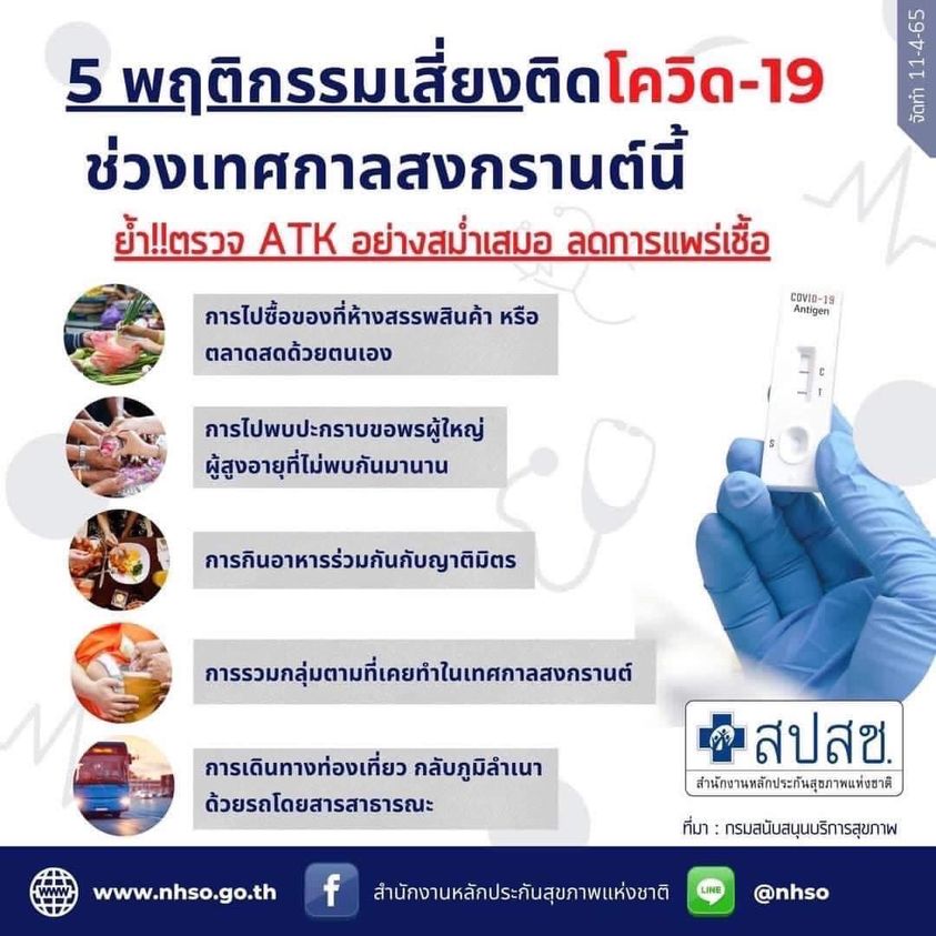 5 พฤติกรรมเสี่ยงติดโควิด 19 ช่วงเทศกาลสงกรานต์” เน้นตรวจ ATK สม่ำเสมอ ลดการแพร่เชื้อ และป้องกันตนเอง