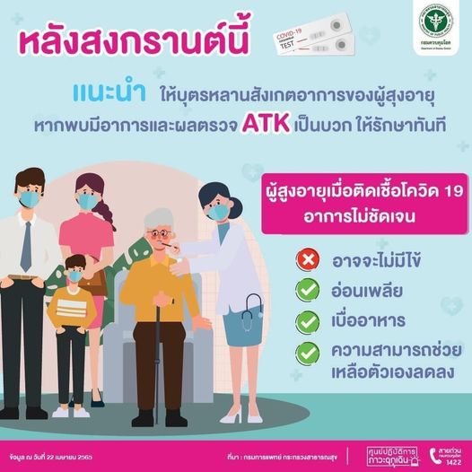 หลังจากกลับจากเทศกาลสงกรานต์ แนะนำให้บุตรหลานสังเกตุอาการของผู้สูงอายุ หากพบมีอาการและผลตรวจ ATK เป็นบวก ให้รักษาทันที