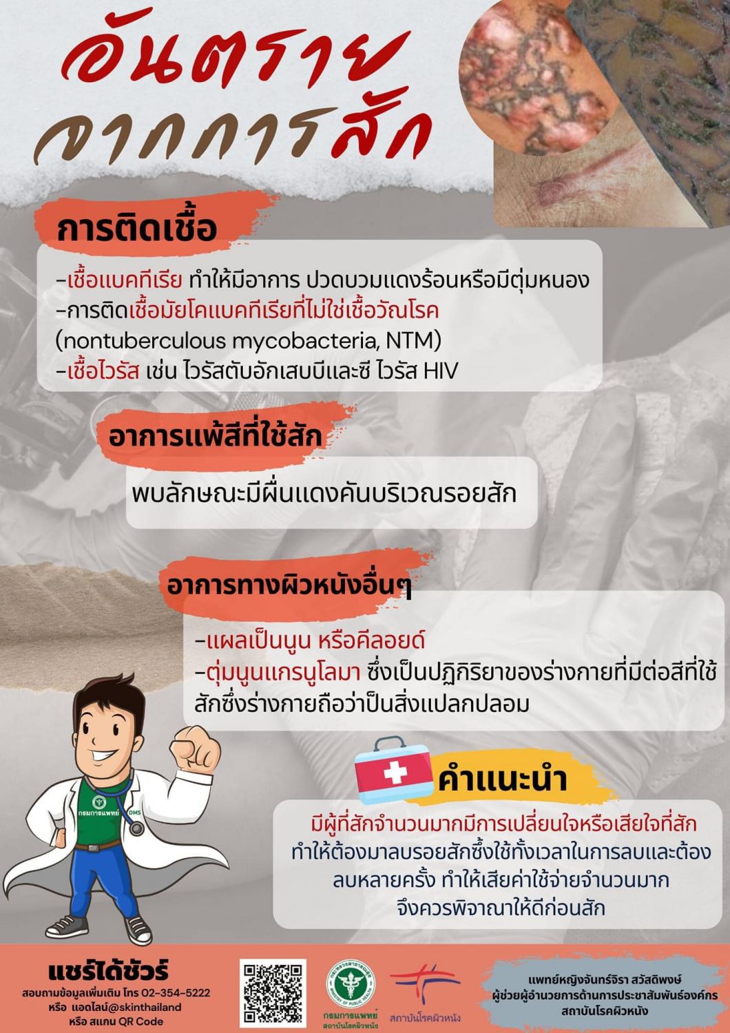 กรมการแพทย์ โดยสถาบันโรคผิวหนัง เตือนสักบริเวณใกล้ตาเสี่ยงอันตรายต่อดวงตาและเสี่ยงต่อการเกิดแผลหรือมีการติดเชื้อและภาวะแทรกซ้อนตามมาได้ ควรตระหนักก่อนทุกครั้งก่อนตัดสินใจสัก