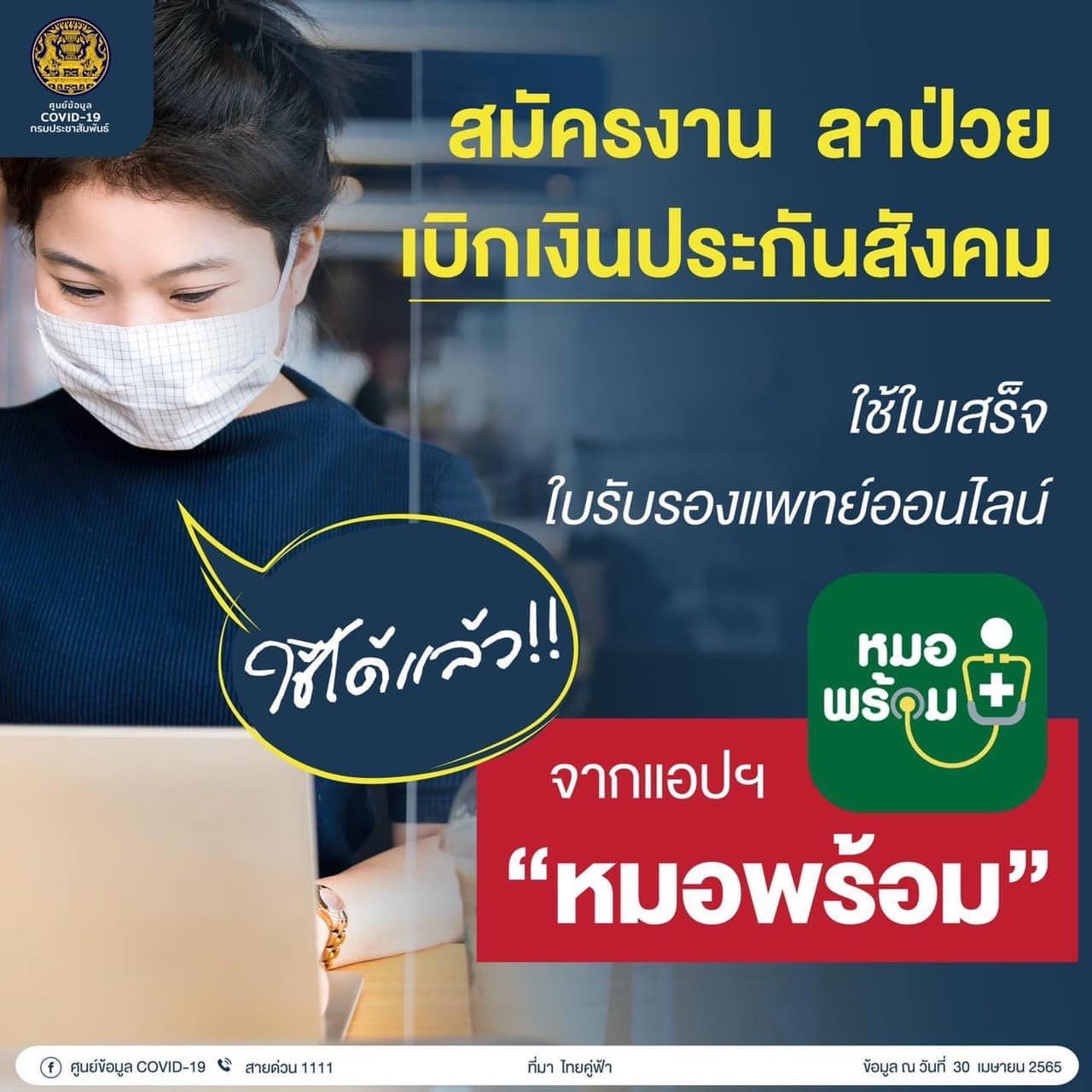 ผู้ประกันตนสามารถตรวจสอบรายชื่อหน่วยบริการที่เข้าร่วม ออกเอกสารใบรับรองแพทย์อิเล็กทรอนิกส์ได้ที่เว็บไซต์กระทรวงสาธารณสุข https://mohpromt.moph.go.th/mpc/mophcertificate/ หรือสอบถามรายละเอียดเพิ่มเติม สายด่วน 1506 ให้บริการตลอด 24 ชั่วโมง