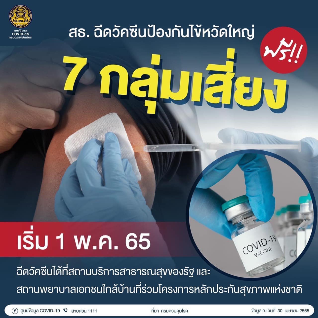 สาธารณสุขให้บริการฉีดวัคซีนป้องกันไข้หวัดใหญ่ 7 กลุ่มเสี่ยง ฟรี เริ่ม 1 พฤษภาคม พ.ศ. 2565 ได้ที่สถานบริการสาธารณสุขของรัฐ และสถานพยาบาลเอกชนใกล้บ้านที่ร่วมโครงการหลักประกันสุขภาพแห่งชาติ