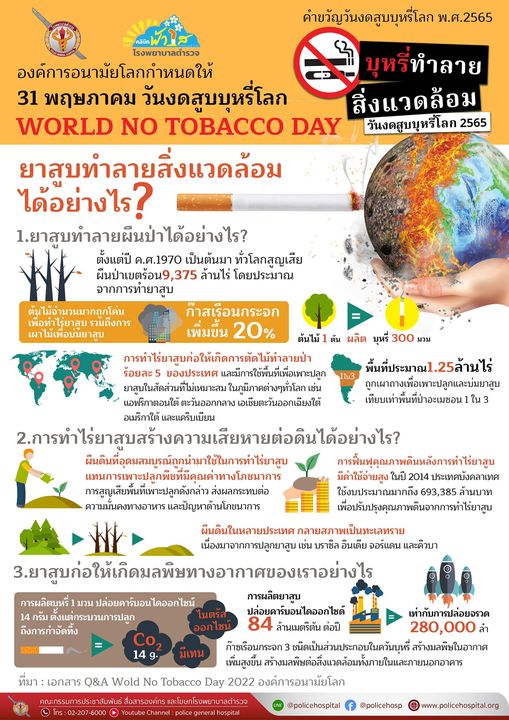 เนื่องในโอกาสวันงดสูบบุหรี่โลก ในวันอังคารที่ 31 พฤษภาคม พ.ศ. 2565 คณะทำงานโรงพยาบาลตำรวจปลอดบุหรี่ ขอเชิญชวนข้าราชการตำรวจ บุคลากรโรงพยาบาลตำรวจ และประชาชน ตระหนักถึงโทษและพิษภัย ของบุหรี่และบุหรี่ไฟฟ้า