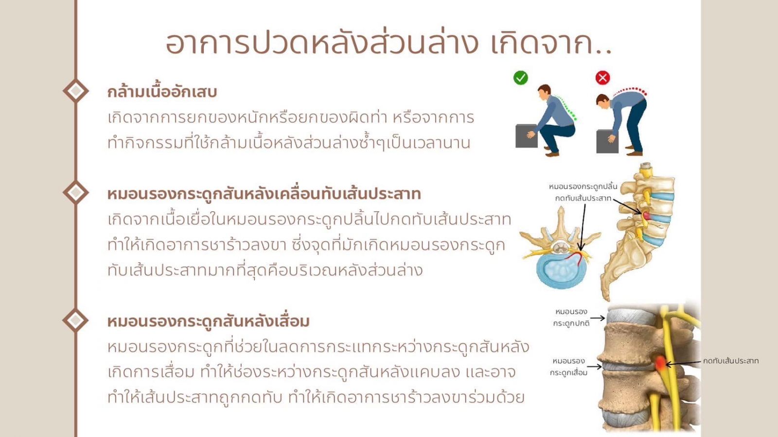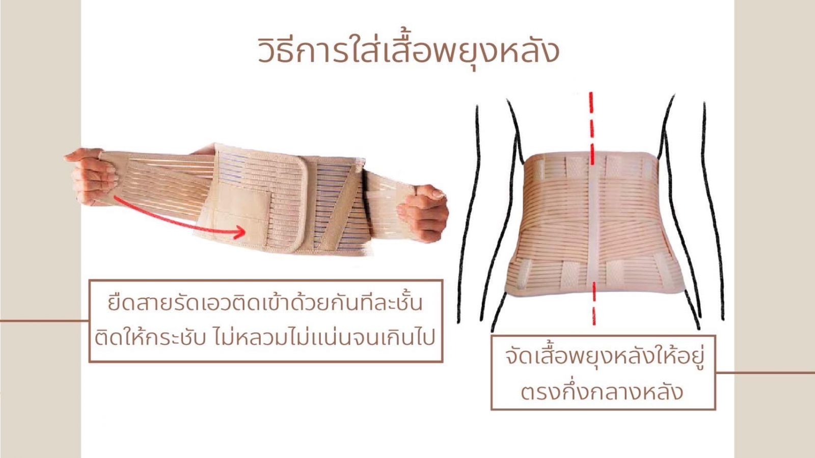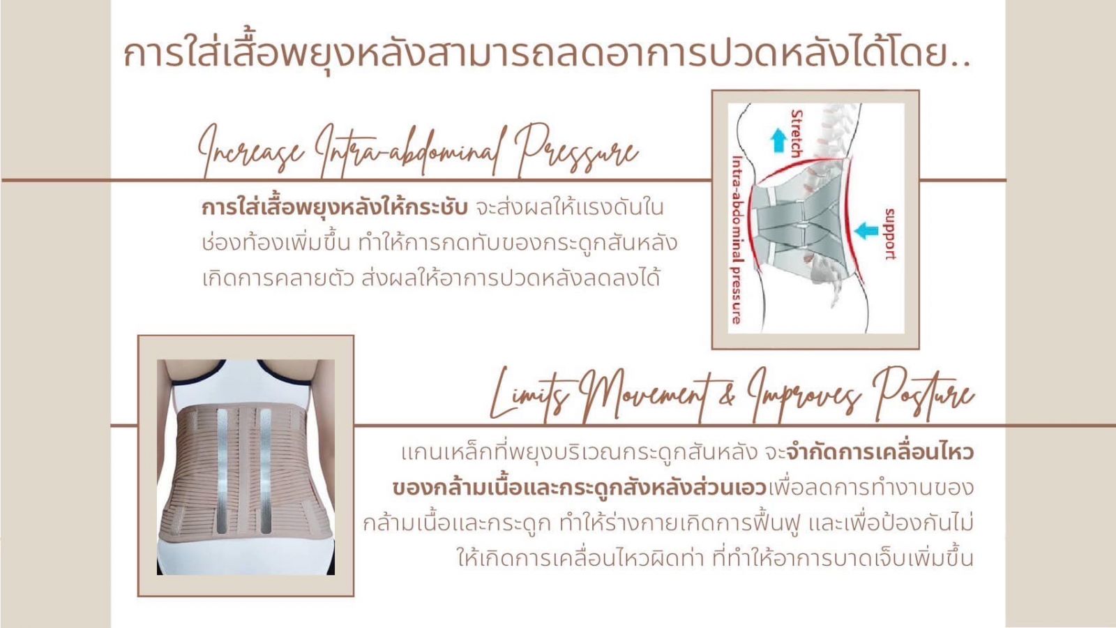 - ‪การใส่เสื้อพยุงหลังให้กระชับ จะส่งผลให้แรงดันในช่องท้องเพิ่มขึ้น ทำให้การกดทับของกระดูกสันหลัง‬เกิดการคลายตัว ส่งผลให้อาการปวดหลังลดลง