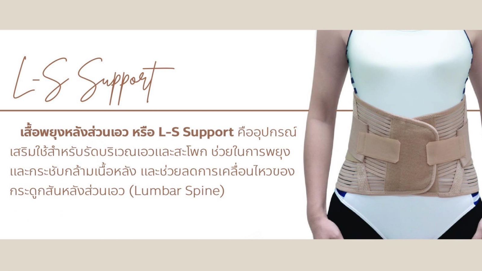 ‪เสื้อพยุงหลังส่วนเอว หรือ L-S Support คืออุปกรณ์เสริมใช้สำหรับรัดบริเวณเอวและสะโพก ช่วยในการพยุงและกระชับกล้ามเนื้อหลัง และช่วยลดการเคลื่อนไหวของกระดูกสันหลังส่วนเอว (Lumbar Spine) โดย‬การใส่เสื้อพยุงหลังสามารถลดอาการปวดหลังได้จาก