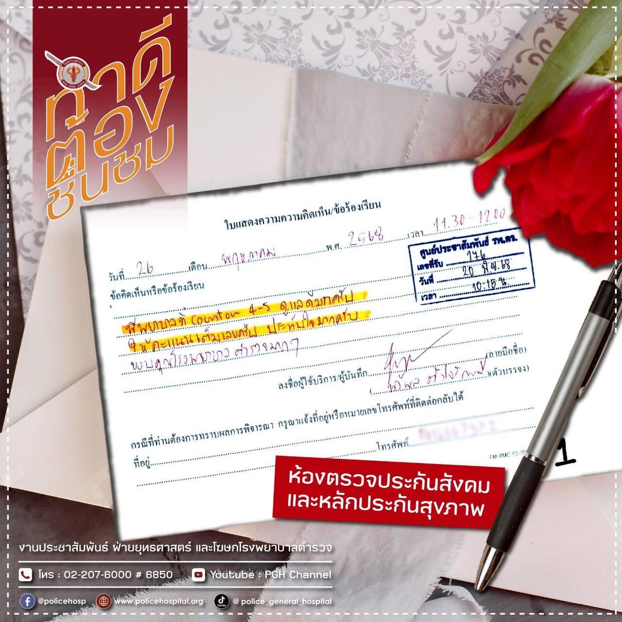 ผู้ป่วยที่มาใช้บริการห้องตรวจประกันสังคม และหลักประกันสุขภาพ โรงพยาบาลตำรวจ ชื่นชมและประทับใจ พยาบาลประจำ เคาน์เตอร์ 4-5 ที่ทุ่มเทการปฏิบัติหน้าที่ ดูแลเอาใจใส่ผู้ป่วยเป็นอย่างดี