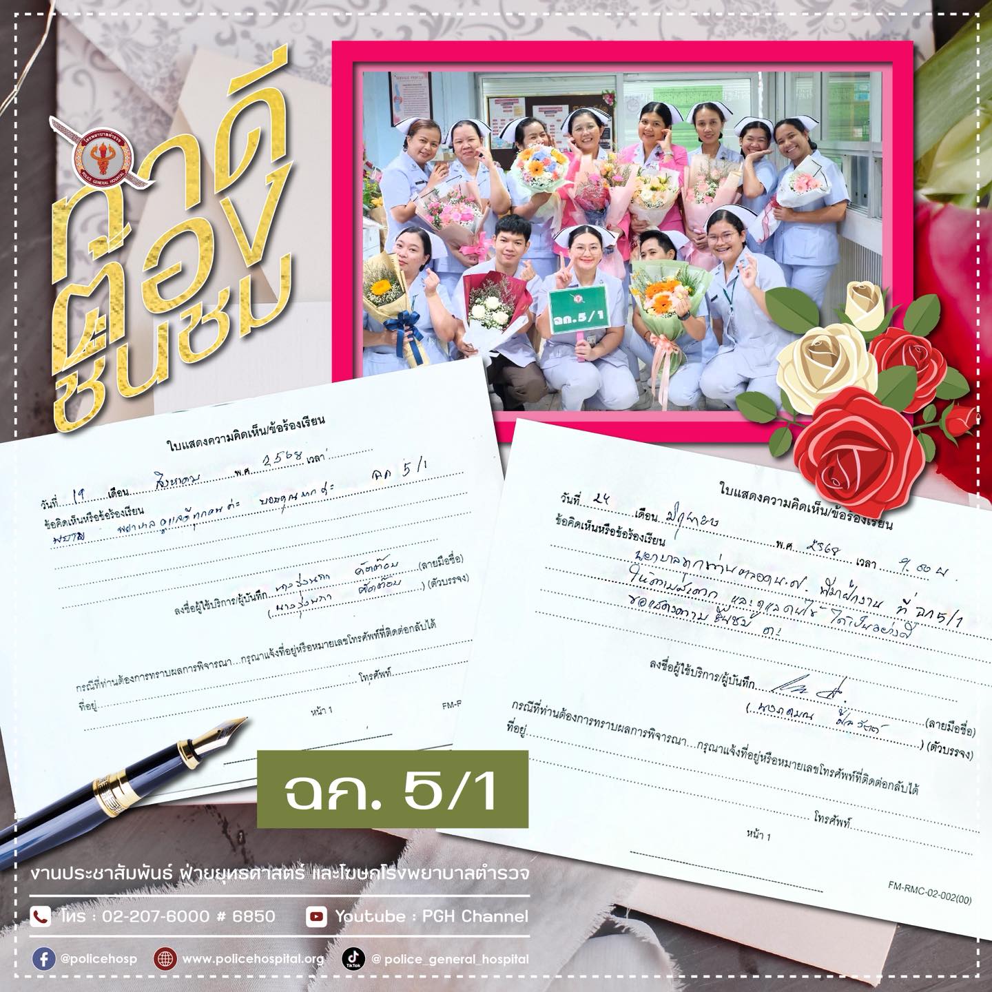 ผู้ป่วยที่ใช้บริการ หอผู้ป่วย ฉก. 5/1 โรงพยาบาลตำรวจ ประทับใจการให้บริการของพยาบาล และ นักศึกษาฝึกงาน ที่ให้ความช่วยเหลือ อำนวยความสะดวก และดูแลผู้ป่วยอย่างดี ขอชื่นชมทุกคนจากใจจริง
