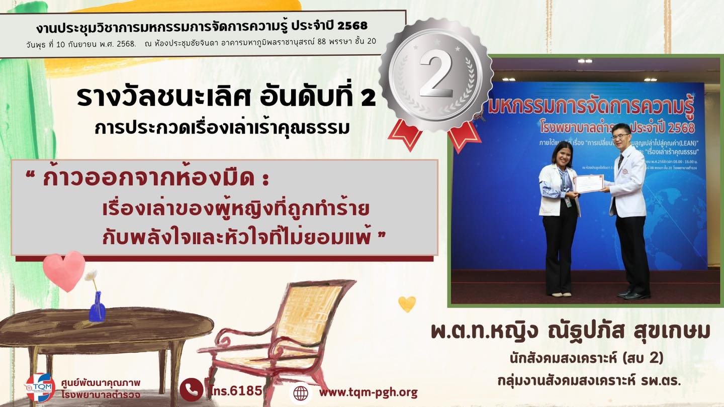 รางวัลชนะเลิศอันดับ 2 ได้รับเงินรางวัล 3,000 บาท ได้แก่ พ.ต.ท.หญิง ณัฐปภัส สุขเกษม นักสังคมสงเคราะห์ (สบ 2) กลุ่มงานสังคมสงเคราะห์ โรงพยาบาลตำรวจ ผลงาน “ก้าวออกจากห้องมืด : เรื่องเล่าของผู้หญิงที่ถูกทำร้าย กับพลังพลังใจและหัวใจที่ไม่ยอมแพ้”