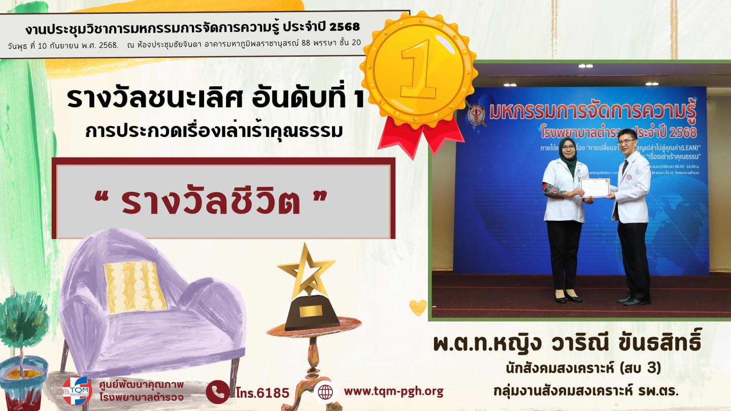 รางวัลชนะเลิศ อันดับ 1 ได้รับเงินรางวัล 5,000 บาท พร้อมโล่ประกาศเกียรติคุณ ได้แก่ พ.ต.ท.หญิง วาริณี ขันธสิทธิ์ นักสังคมสงเคราะห์ (สบ 3) กลุ่มงานสังคมสงเคราะห์ โรงพยาบาลตำรวจ ผลงาน “ รางวัลชีวิต”