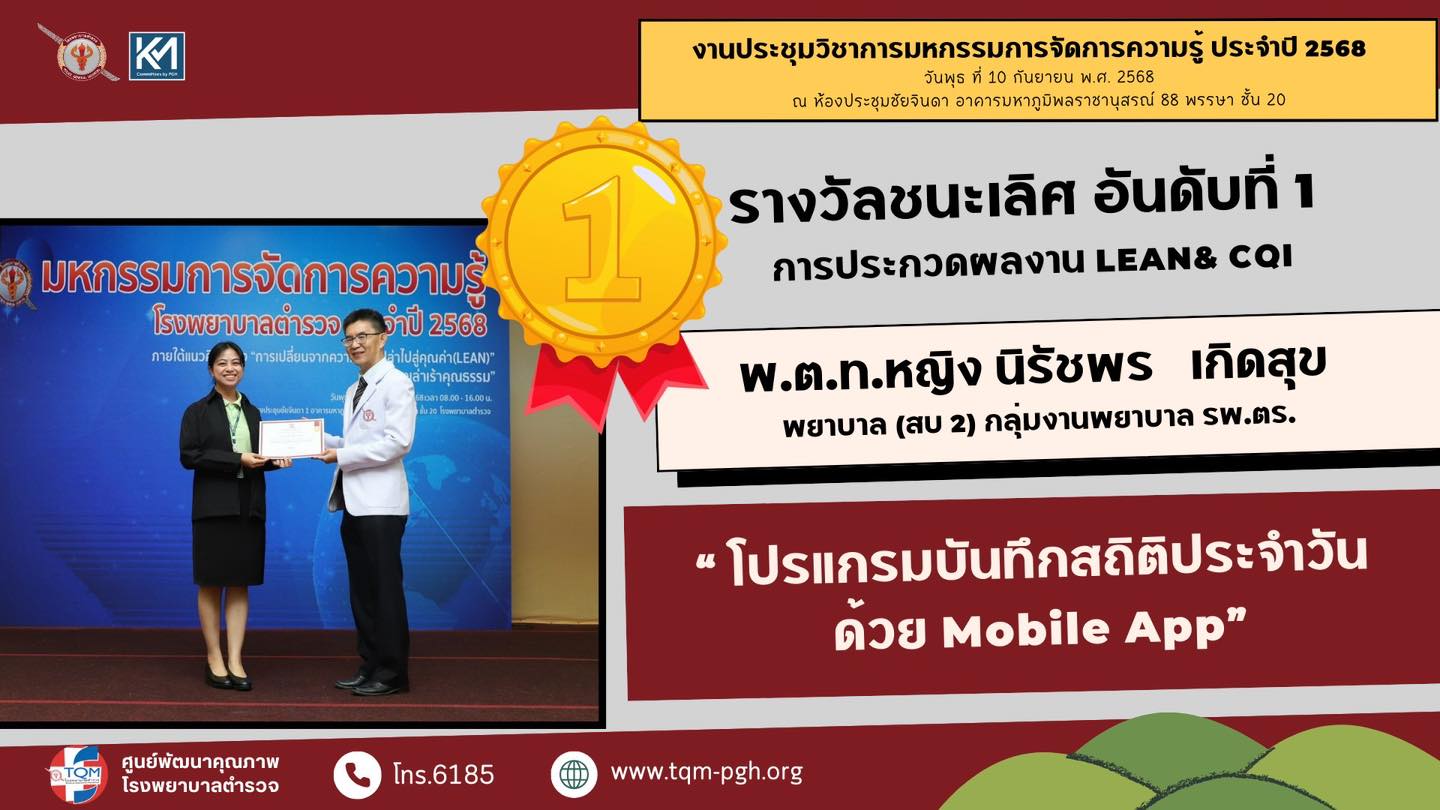รางวัลชนะเลิศ อันดับ 1 ได้รับเงินรางวัล 5,000 บาท พร้อมโล่ประกาศเกียรติคุณ ได้แก่ พ.ต.ท.หญิง นิรัชพร เกิดสุข ผลงาน พยาบาล (สบ 2) กลุ่มงานพยาบาล โรงพยาบาล ผลงาน ”โปรแกรมบันทึกสถิติประจำวัน ด้วย“Mobile App"