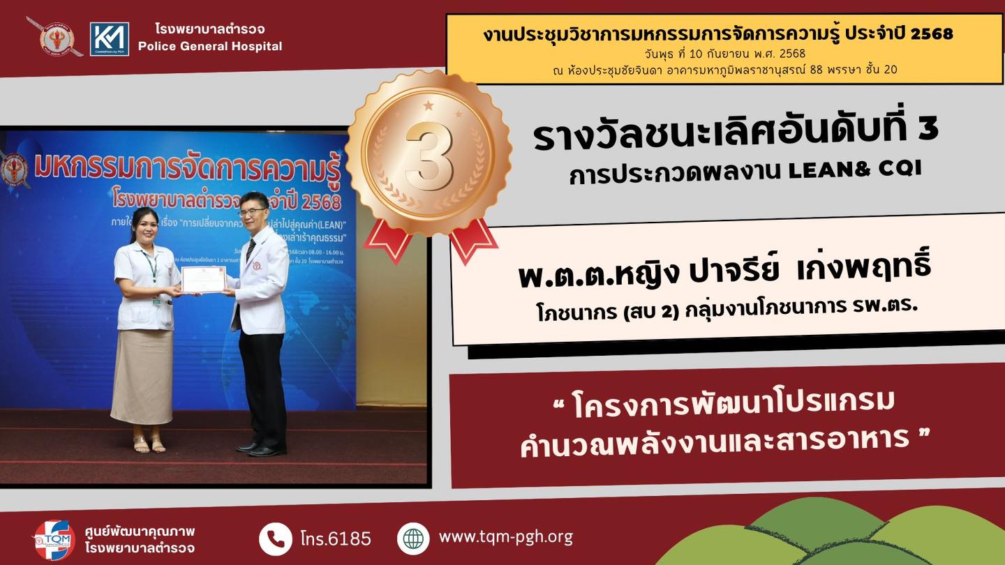 รางวัลชนะเลิศอันดับ 3 ได้รับเงินรางวัล 1,000 บาท ได้แก่ พ.ต.ต.หญิง ปาจรีย์ เก่งพฤทธิ์ โภชนาการ (สบ 2) กลุ่มงานโภชนาการ โรงพยาบาลตำรวจ ผลงาน “ โครงการพัฒนาโปรแกรมคำนวณพลังงานและสารอาหาร”