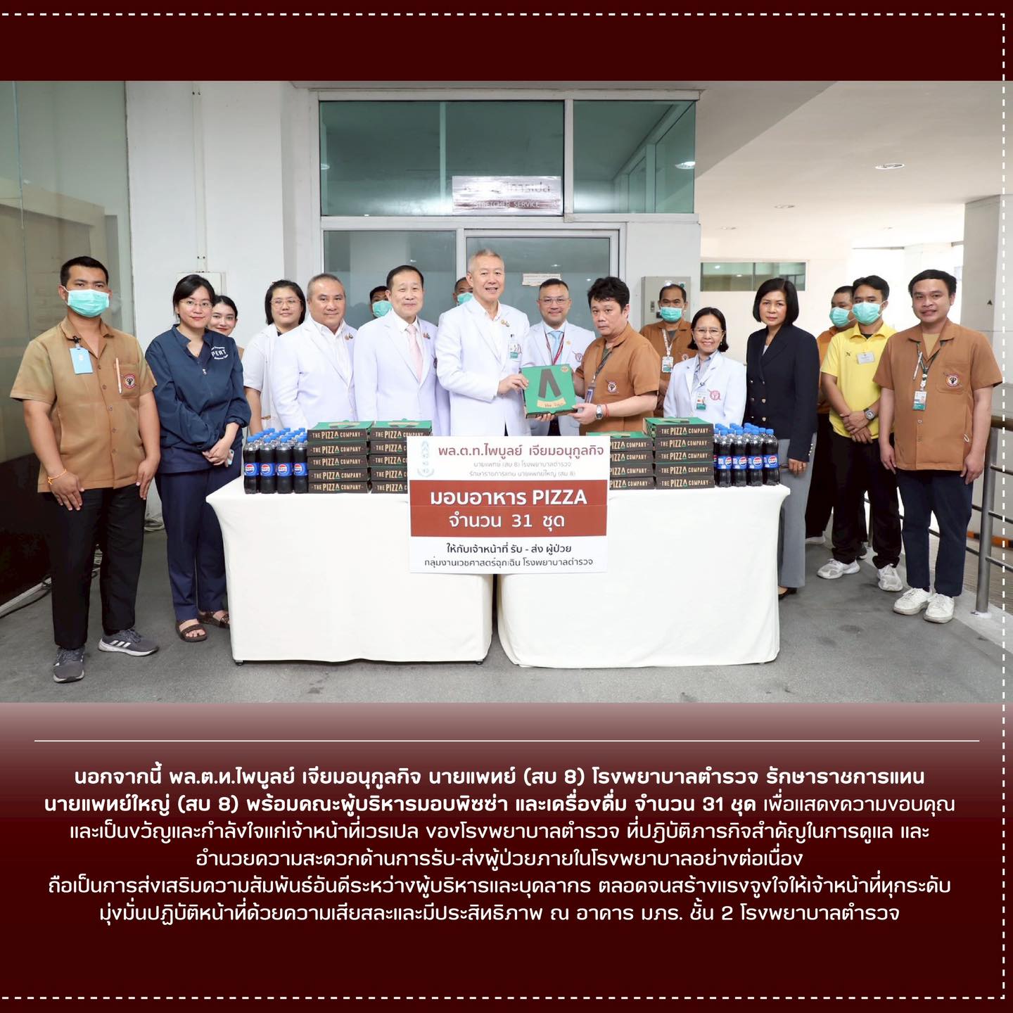นอกจากนี้ พล.ต.ท.ไพบูลย์ เจียมอนุกูลกิจ นายแพทย์ (สบ 8)โรงพยาบาลตำรวจ รักษาราชการแทนนายแพทย์ใหญ่ (สบ 8)พร้อมคณะผู้บริหารมอบพิซซ่า เพื่อแสดงความขอบคุณ และเป็นขวัญและกำลังใจแก่เจ้าหน้าที่เวรเปลของโรงพยาบาลตำรวจ ณ อาคาร มภร. ชั้น 2 โรงพยาบาลตำรวจ