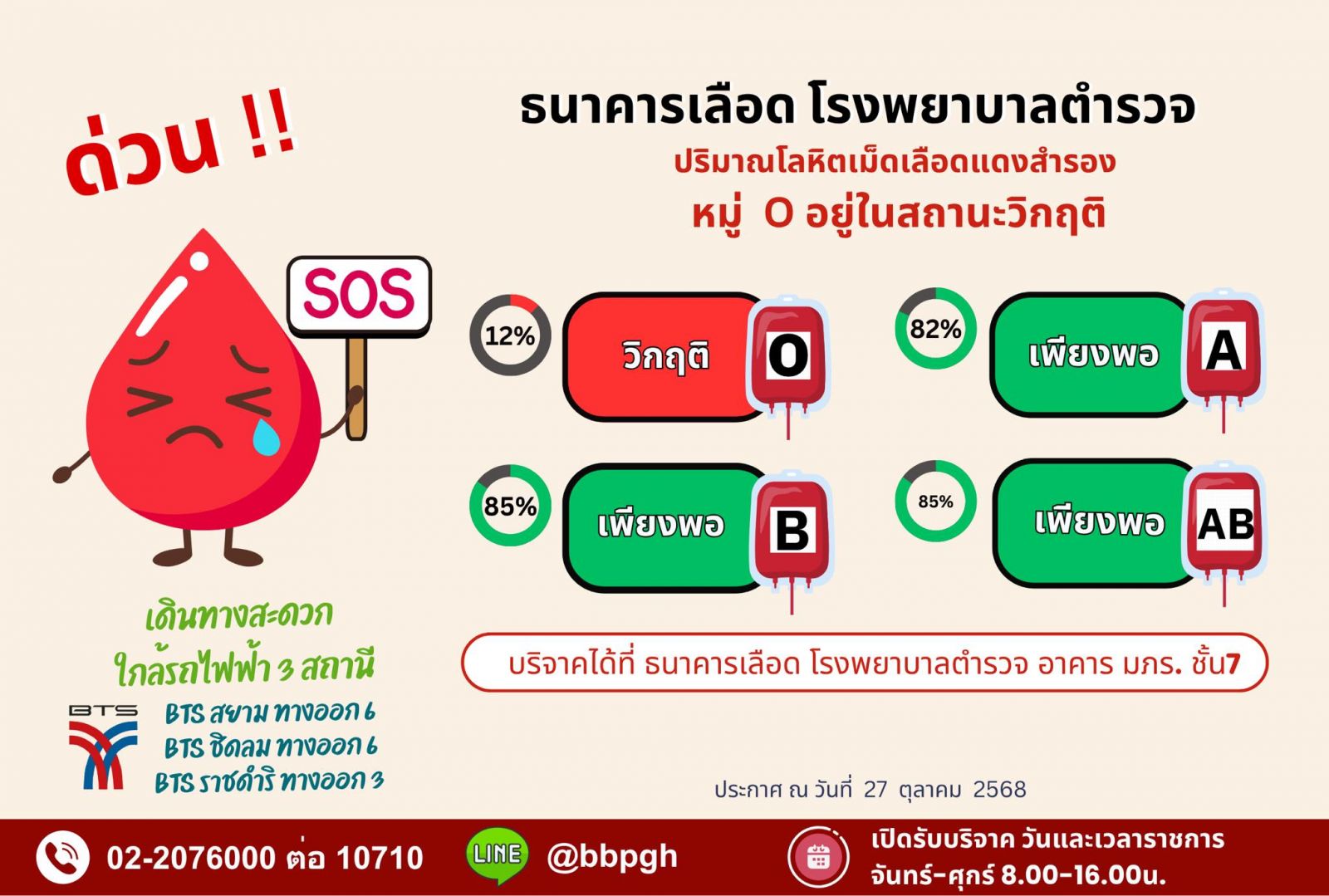 เนื่องจากขณะนี้ปริมาณโลหิตเม็ดเลือดแดงสำรองในคลังของธนาคารเลือดโรงพยาบาลตำรวจ หมู่ O อยู่ในสถานะวิกฤติ และยังมีผู้ป่วยที่มีความจำเป็นต้องรับโลหิต