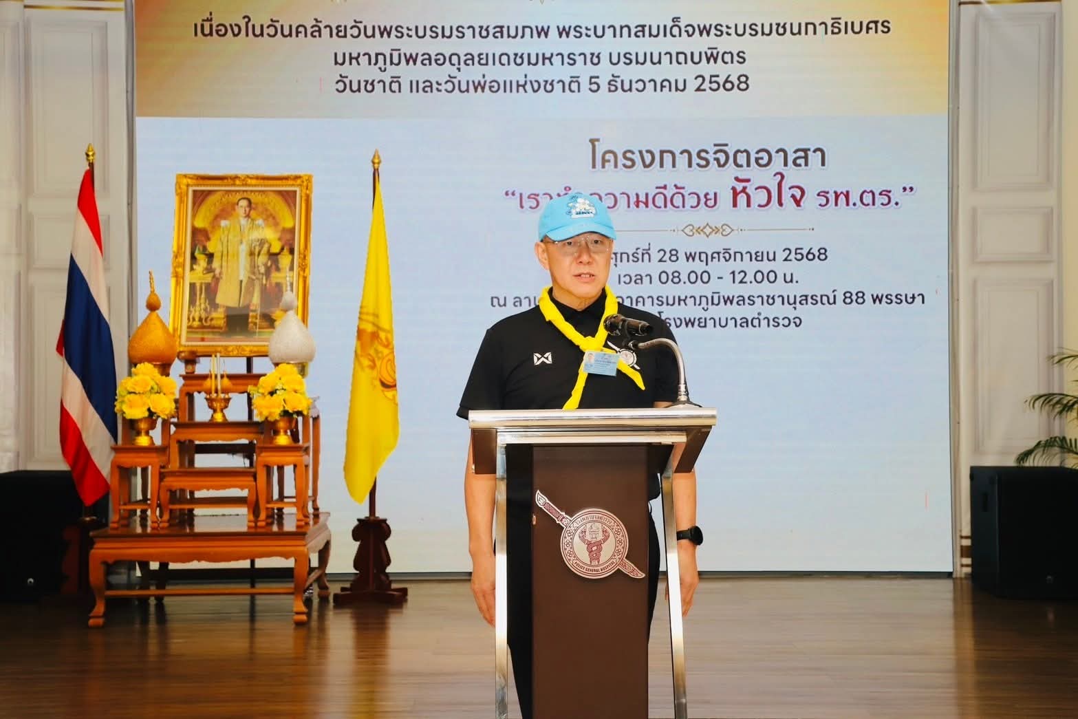 วันศุกร์ที่ 28 พฤศจิกายน 2568 ณ ลานกิจกรรม ชั้น 2 อาคารมหาภูมิพลราชานุสรณ์ 88 พรรษา โรงพยาบาลตำรวจ พล.ต.ท.ไพบูลย์ เจียมอนุกูลกิจ นายแพทย์ (สบ 8)โรงพยาบาลตำรวจ รักษาราชการแทน นายแพทย์ใหญ่ (สบ8)เปิด “โครงการจิตอาสา เราทำความ ดี ด้วยหัวใจ“ โรงพยาบาลตำรวจ เนื่องในวันคล้ายวันพระบรมราชสมภพ พระบาทสมเด็จพระบรมชนกาธิเบศร มหาภูมิพลอดุลยเดชมหาราช บรมนาถบพิตร วันชาติ และวันพ่อแห่งชาติ 5 ธ.ค.