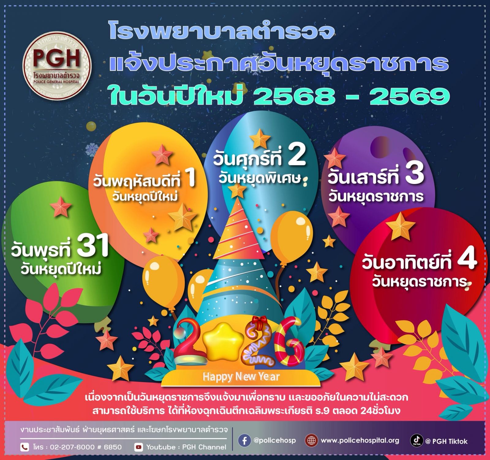 โรงพยาบาลตำรวจ ประกาศวันหยุดราชการ และวันหยุดพิเศษ เนื่องในเทศกาล วันขึ้นปีใหม่ 2568 - 2569