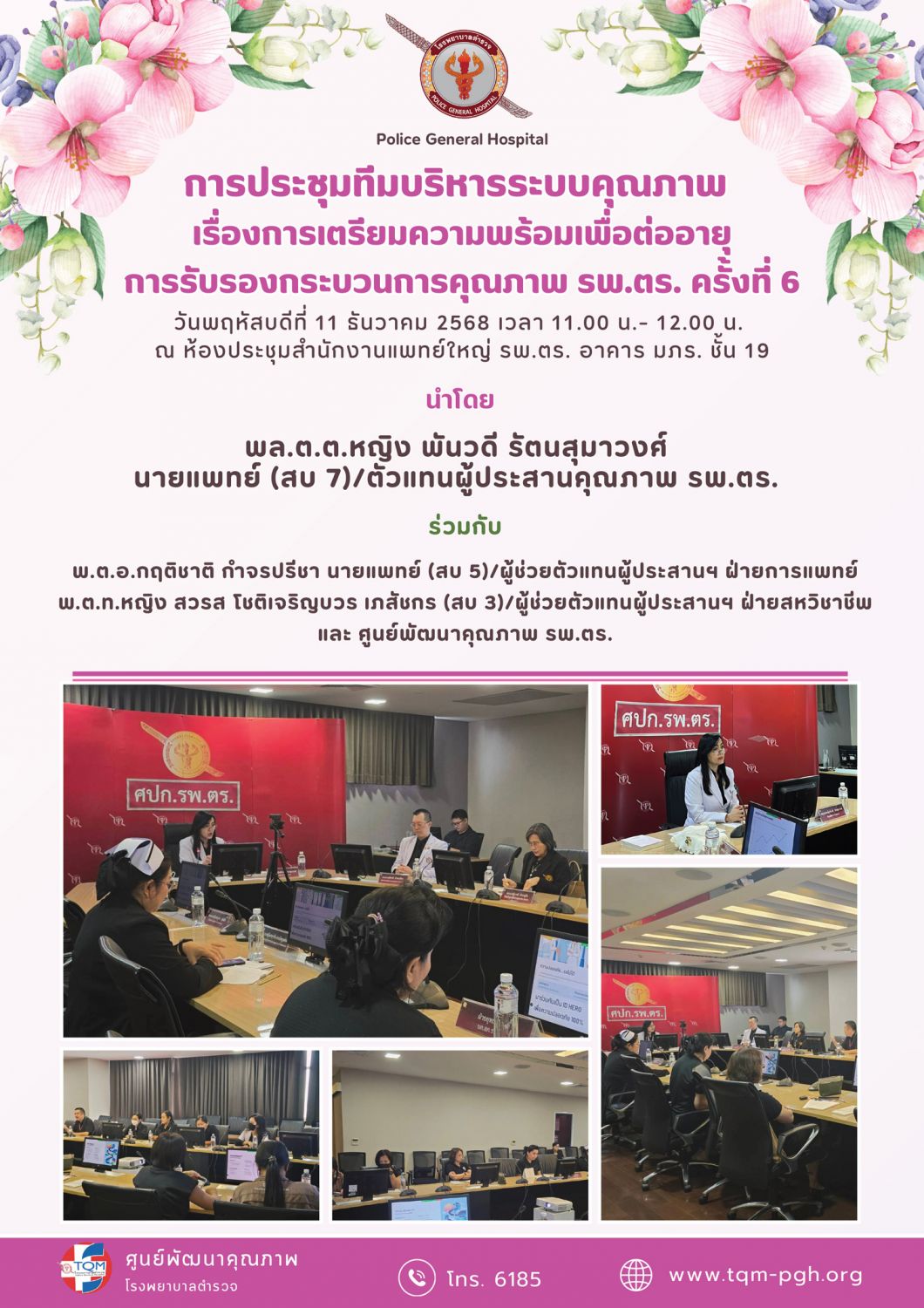 การประชุมทีมบริหารระบบคุณภาพ เรื่องการเตรียมความพร้อมเพื่อต่ออายุการรับรองกระบวนการคุณภาพ ดรงพยาบาลตำรวจ ครั้งที่ 6 ในวันพฟหัสบดีที่ 11 ะันวาคม 2568 ณ ห้องประชุมสำนักงานแพทย์ใหญ่ ชั้น 19 อาคารมหาภูมิพลราชานุสรณ์ 88 พรรษา โรงพยาบาลตำรวจ
