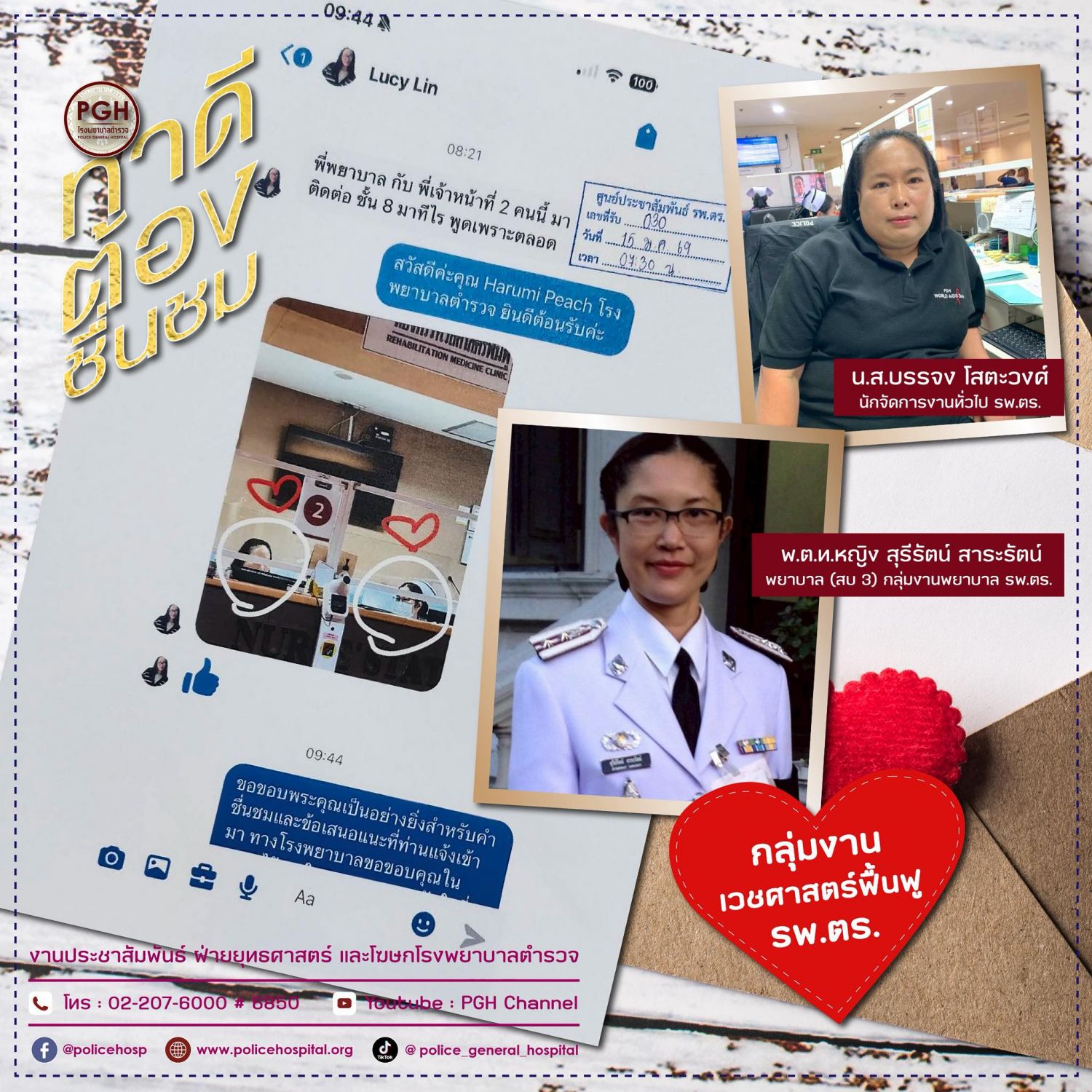 ผู้มาใช้บริการกลุ่มงานเวชศาสตร์ฟื้นฟู โรงพยาบาลตำรวจ ชื่นชมและประทับใจการให้บริการของ พ.ต.ท.หญิง สุรีรัตน์ สาระรัตน์ พยาบาล (สบ 3) กลุ่มงานพยาบาล โรงพยาบาลตำรวจ และ น.ส.บรรจง โสตะวงศ์ นักจัดการงานทั่วไป โรงพยาบาลตำรวจ ที่พูดจาไพเราะ ยิ้มแย้มแจ่มใส และแนะนำผู้มาใช้บริการเป็นอย่างดี