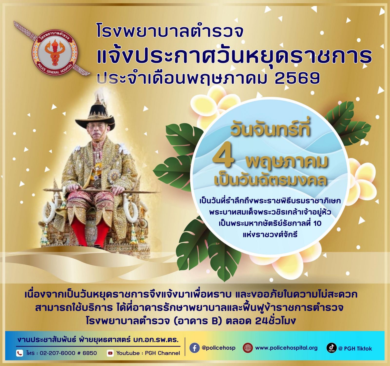 โรงพยาบาลตำรวจ แจ้งประกาศวันหยุดราชการประจำเดือน พฤษภาคม 2569 วันจันทร์ที่ 4 พฤษภาคม เป็นวันฉัตรมงคล