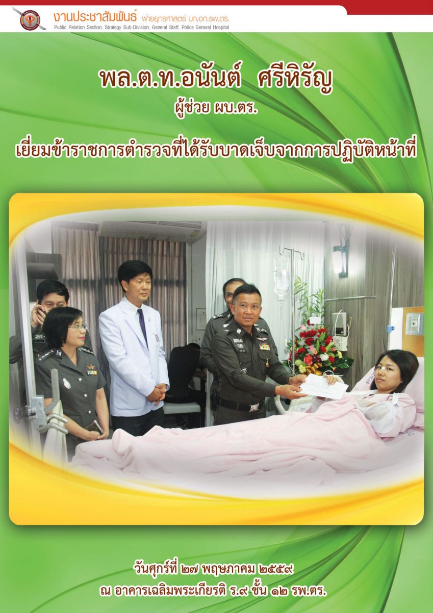 พล.ต.ท.อนันต์ ศรีหิรัญ ผู้ช่วย ผบ.ตร. เยี่ยมข้าราชการตำรวจที่ได้รับบาดเจ็บจากการปฎิบัติหน้าที่ วันศุกร์ ที่ ๒๗ พฤษภาคม ๒๕๕๙ ณ อาคารเฉลิมพระเกียรติ ร.๙ ชั้น ๑๒ รพ.ตร.